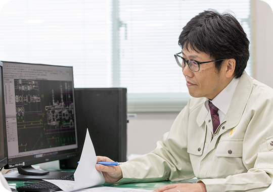 装置やプラントだけでなく、付随する配管や階段の一段一段まですべて設計するのが、当社の機械設計職。そのため、ただCADで作図するだけでなく、お客様や社内メンバーとの打ち合わせ、設置工事現場での確認コミュニケーションを取る場面が多くあります。種々の条件より、より良い装置プラントを作り上げるため、装置が無事に稼働するまで見届けます。図面を書いて終わりではなく、完成したプラント、また実際に処理の状況を目で見て確認できるため、言葉にできないほどの達成感を感じられます。
